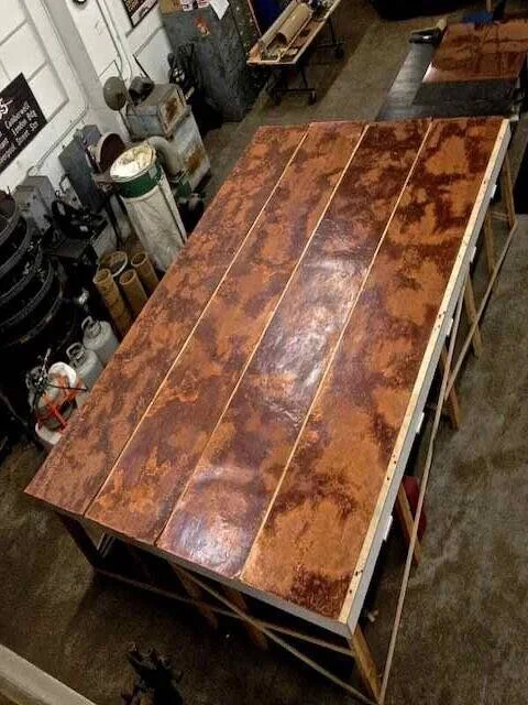 The visual movement of the primary patina was large and organic. So that the pattern would flow uninterrupted along the full width of the soffit, I did the patina work on rolling carts that were butted end to end. This allowed me to bridge the patina application from sheet to sheet preventing a visible break in the natural formations where the sheets would be joined.